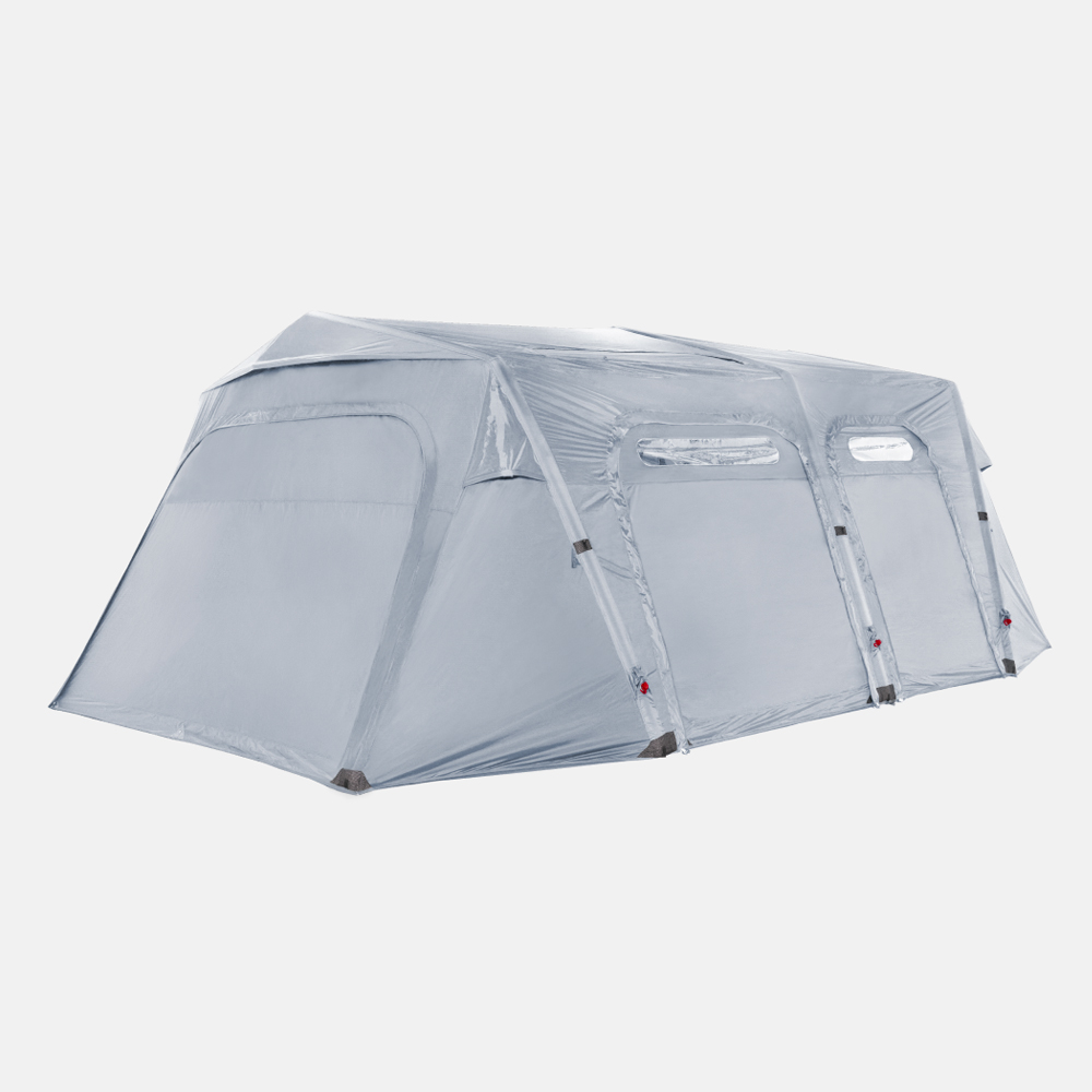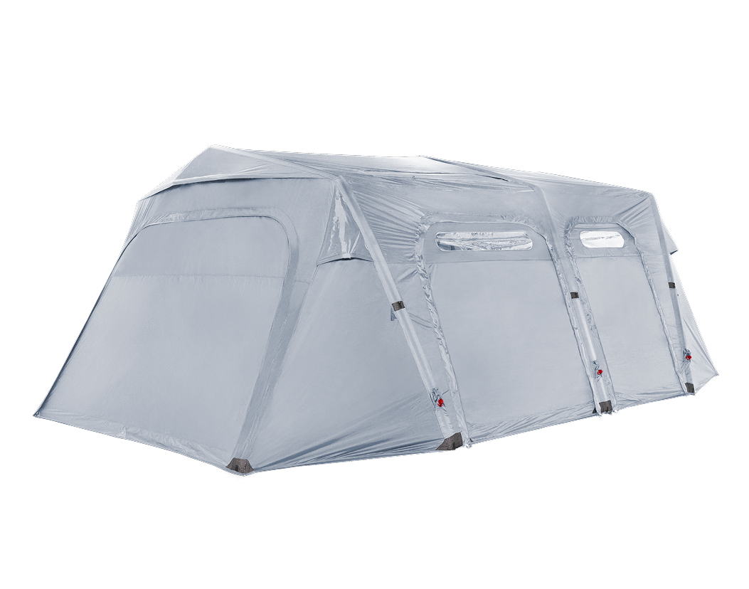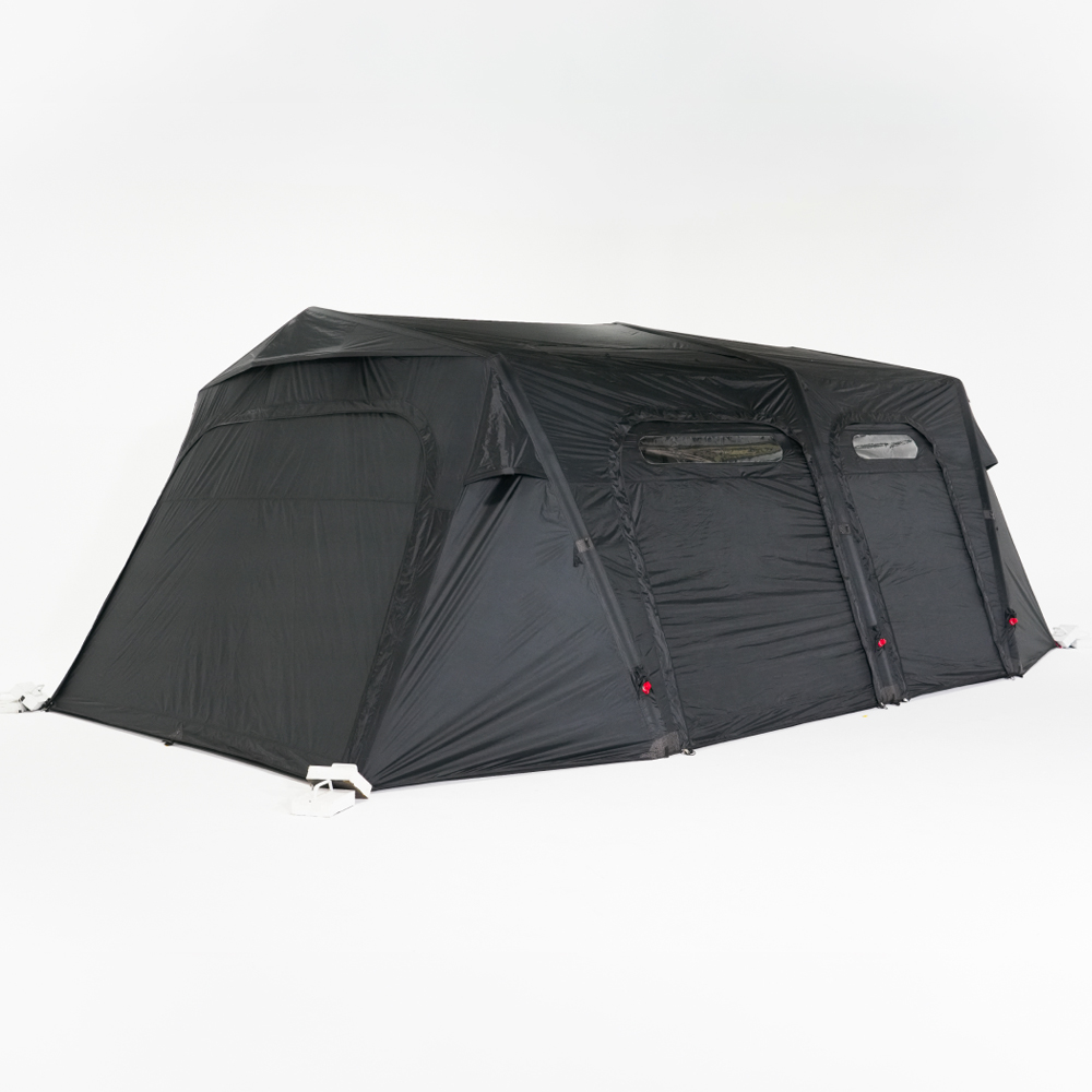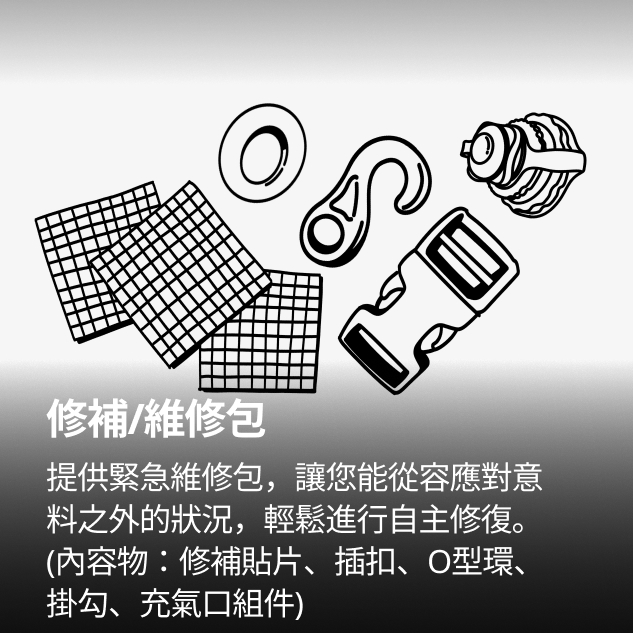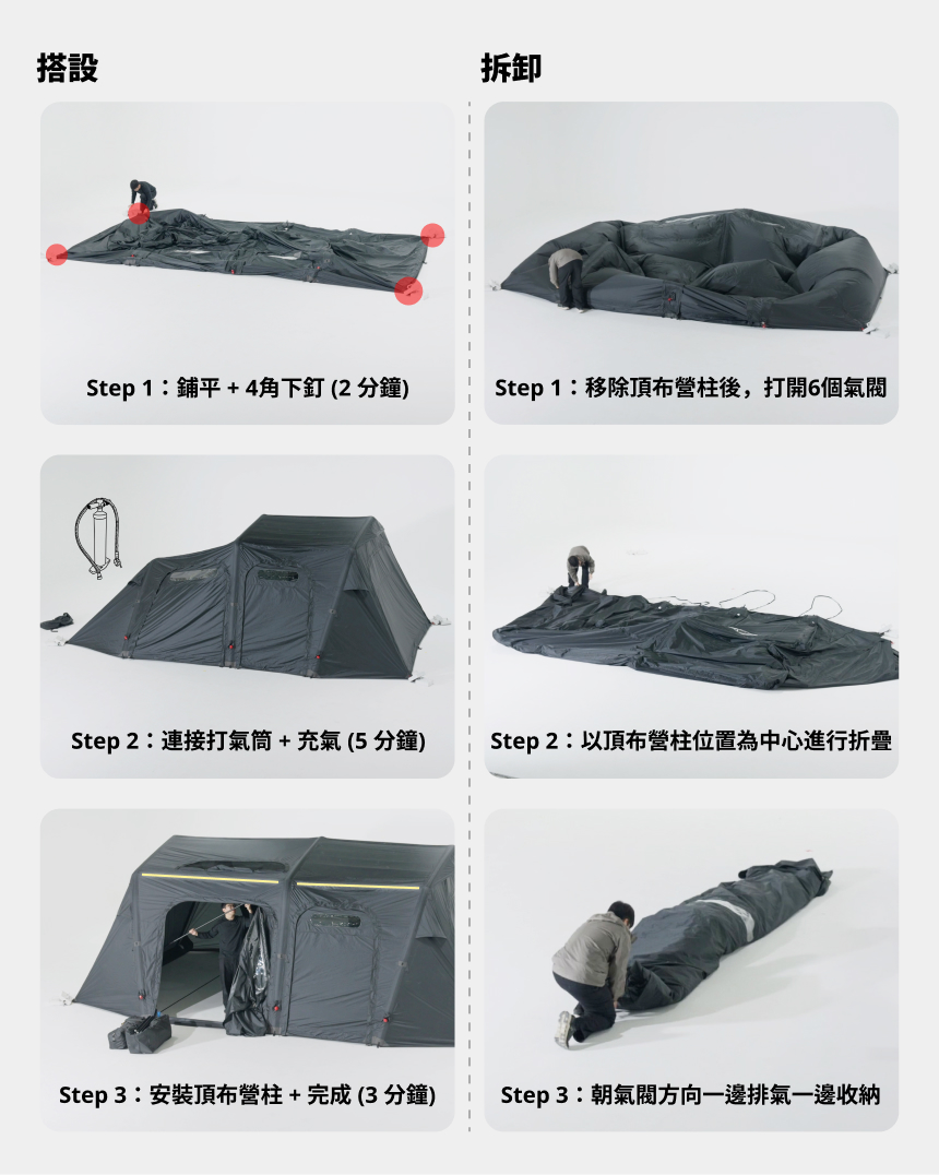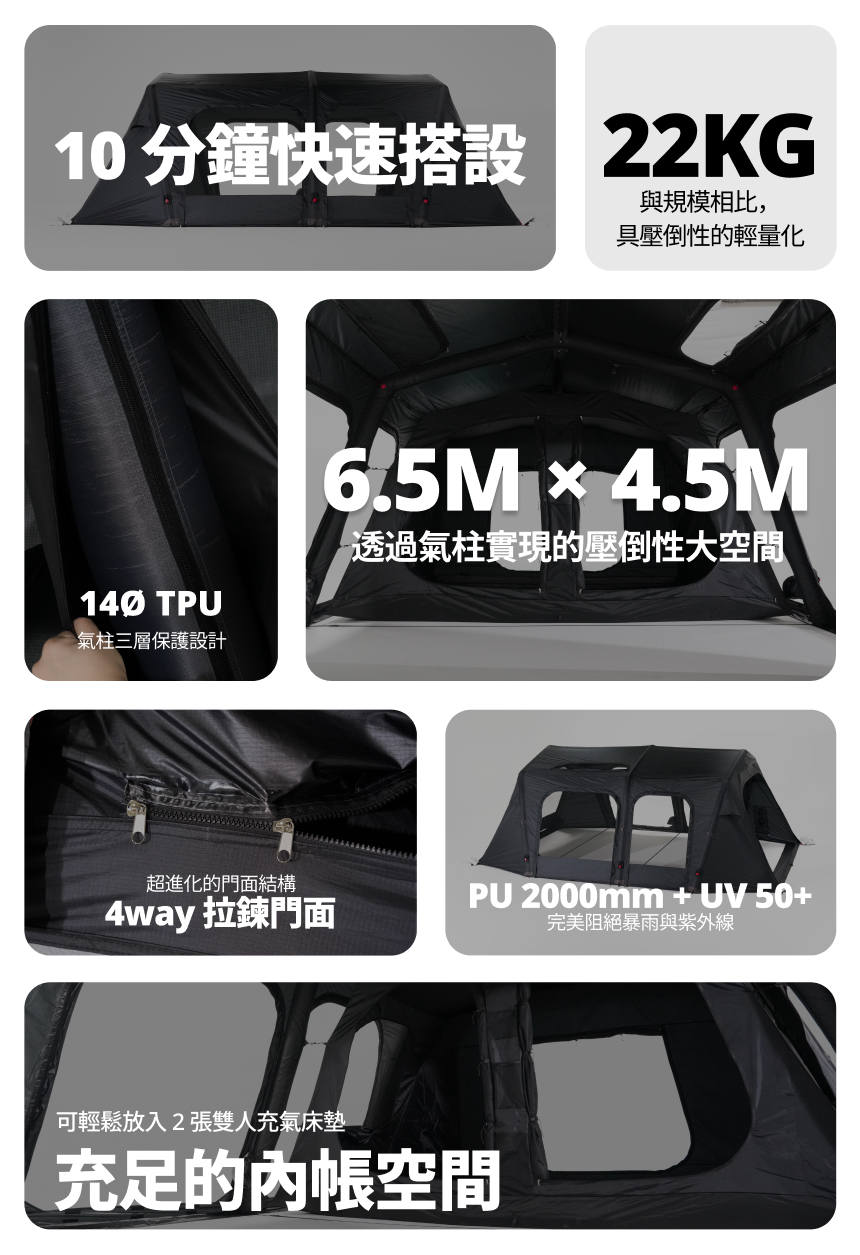 基本配件 : 主帳 / 營釘*12 / 收納袋 / 營繩*6組(已預先安裝於帳篷上) /充氣幫浦 / 前側及側面紗門 + 收納袋 / 頂布 / 頂部支撐鋁合金營柱 / 內襯 / 修補包