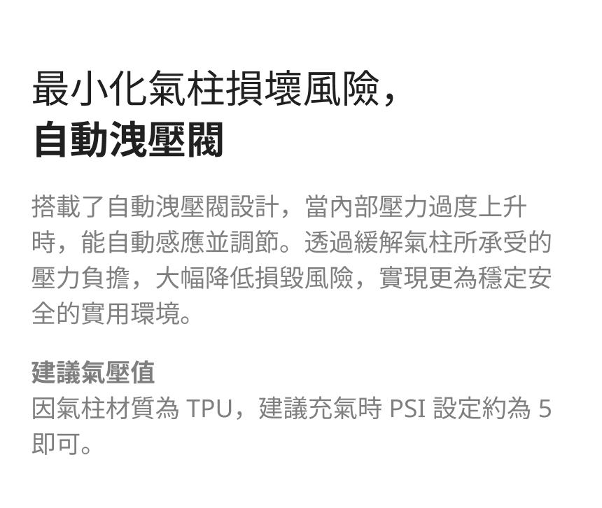 因氣柱材質為 TPU,建議充氣時 PSI 設定約為 5 即可。