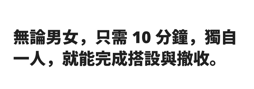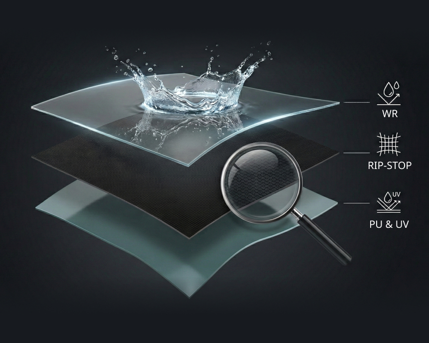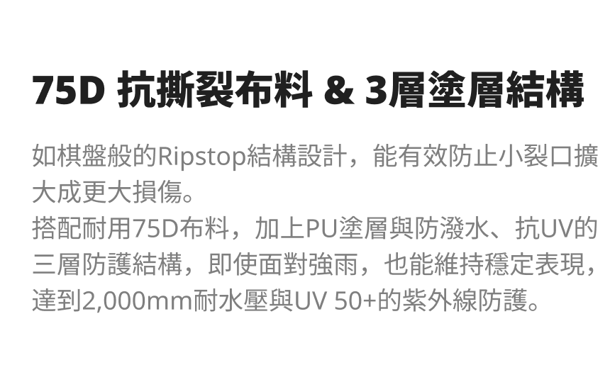 材質 : 外帳 - Poly Rip-Stop 75D 210T PU 2,000mm UV50+ WR