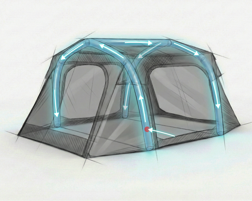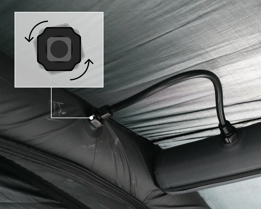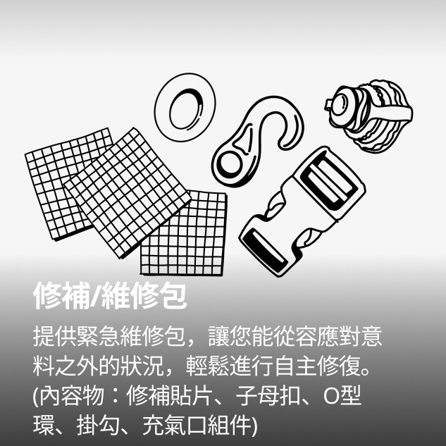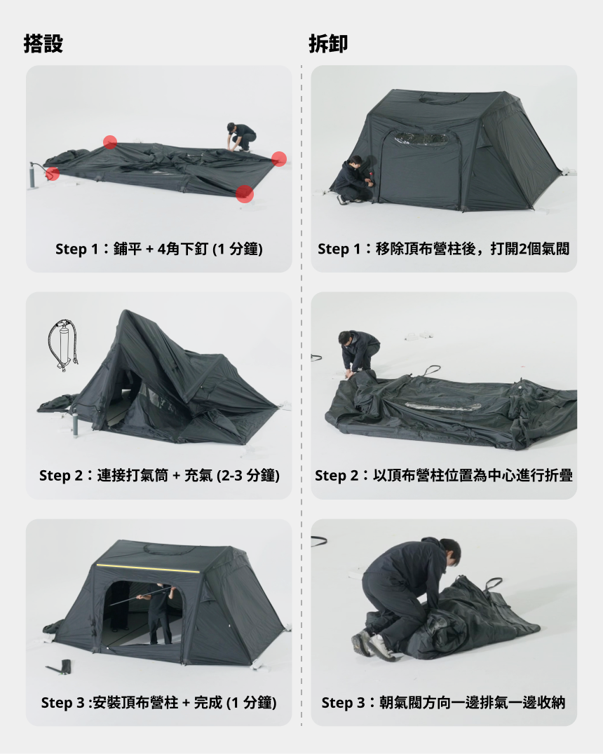 基本配件 : 主帳 / 營釘*12 / 收納袋 / 營繩*4組(已預先安裝於帳篷上) /充氣幫浦 / 前側及側面紗門 + 收納袋 / 頂布 / 頂部支撐鋁合金營柱 / 內襯 / 修補包